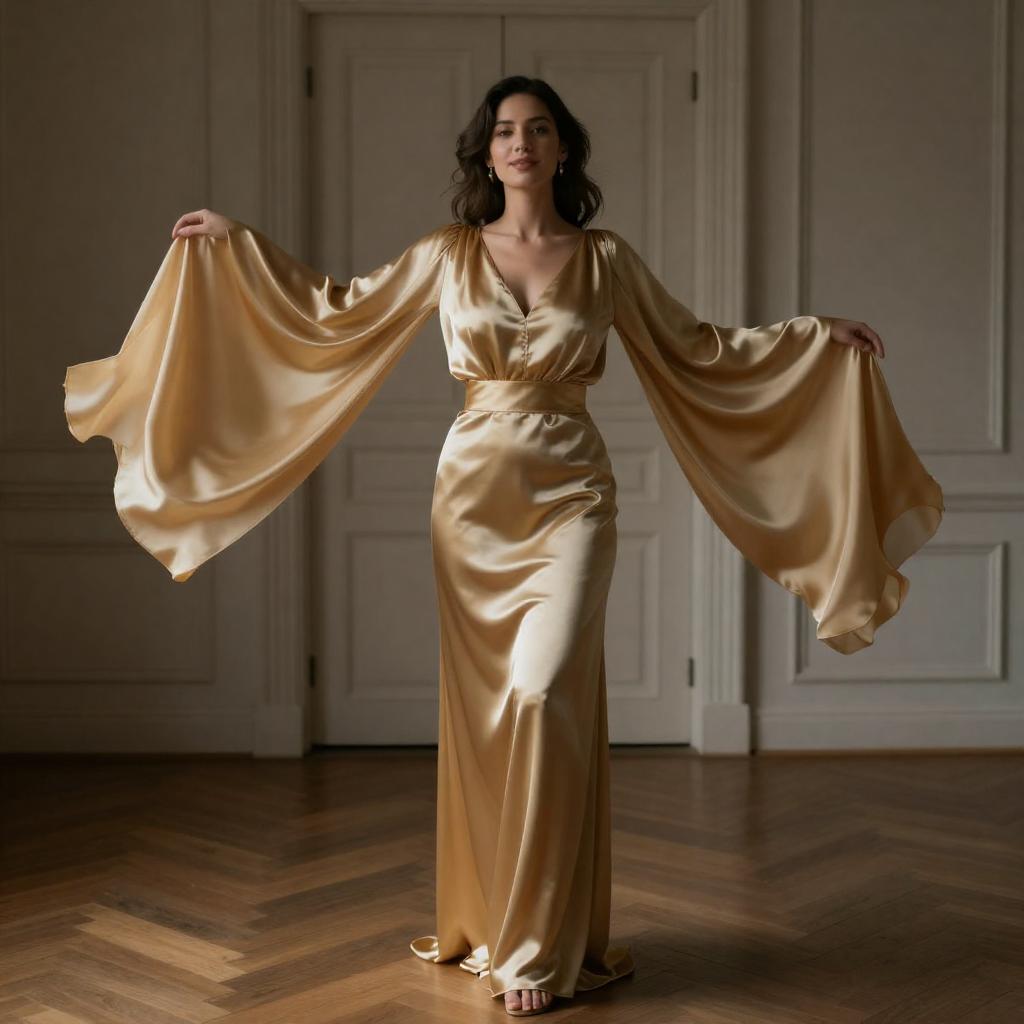 Woman in a golden satin dress with long, flowing sleeves, standing in an elegant room with wooden floors and paneled walls. She extends her arms, holding the fabric, smiling gently. Dim lighting, classical interior. Centered, facing forward.