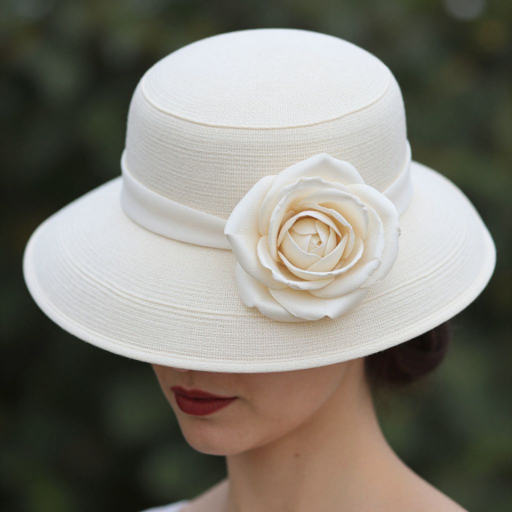 Woman wearing an ivory sinnamay hat with a large side silk rose - The Little Wedding Company