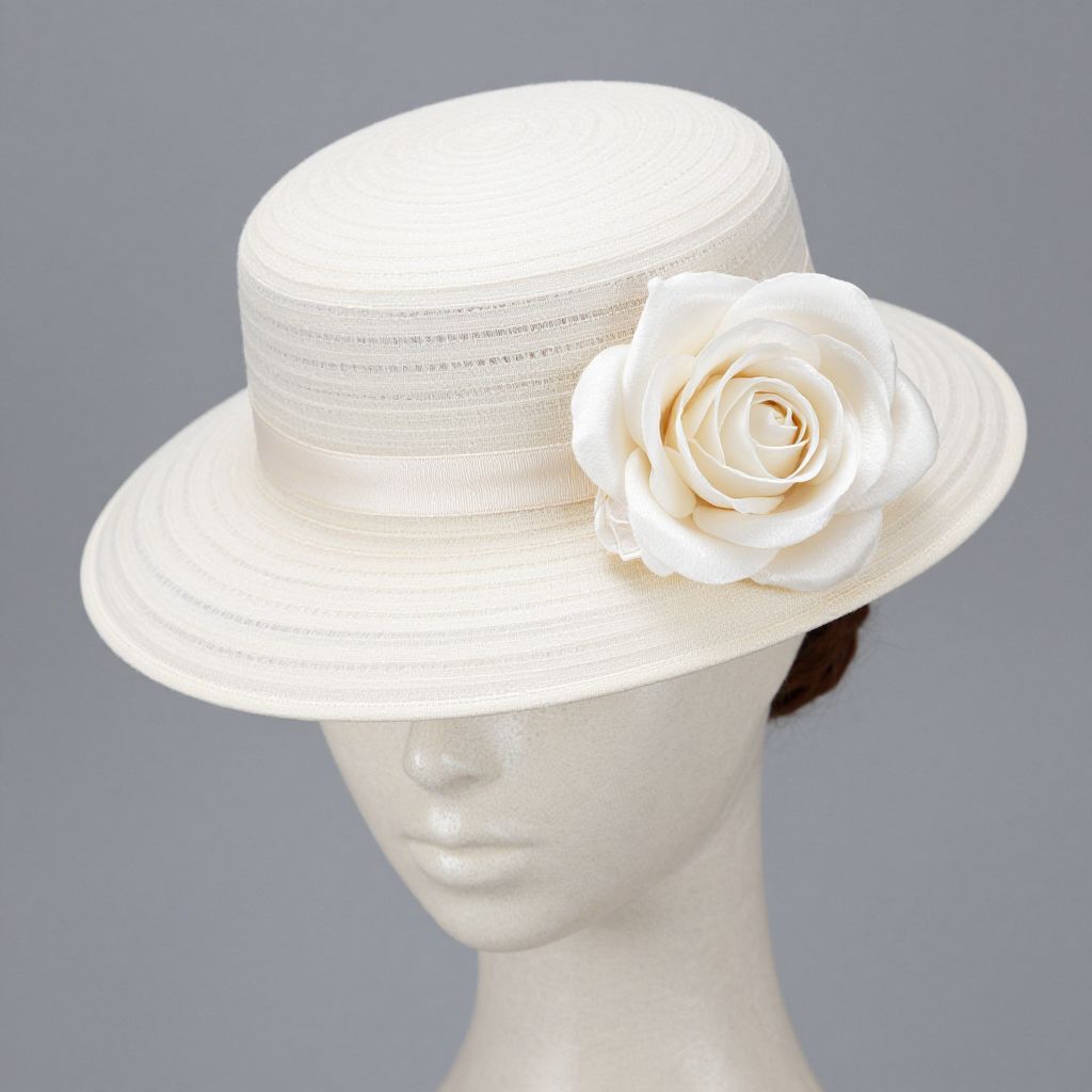 Photograph of a white, lace-trimmed hat with a large, cream-colored rose on the right side, displayed on a white mannequin
