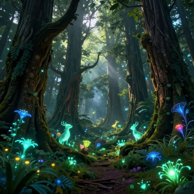 Tando - an enchanted forest scene with glowing bioluminescent plants and magical creatures wandering among towering ancient trees, soft mist and light rays piercing through the canopy, rich textures and vibrant colors creating a serene atmosphere.