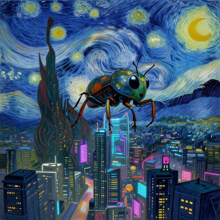 Digital artwork of a giant, colorful insect with large eyes hovering over a neon-lit, futuristic cityscape under a swirling, starry blue night sky
