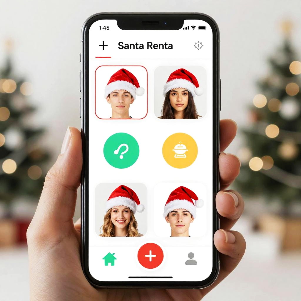 Santa hat editor app displayed on a smartphone, with options to add, rotate and resize Santa hats on portraits, colorful icons and holiday motifs decorating the interface, evoking festive cheer and digital convenience.