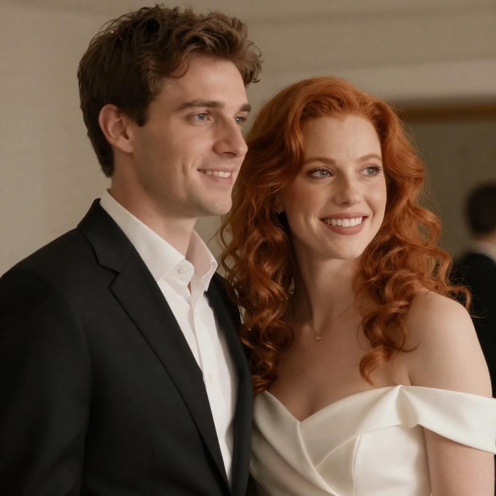 Photograph of a blonde woman with large, curled hair and heavy eyeliner, leaning her head against a man in a black suit and glasses. She has a pensive expression. The man looks forward, slightly smiling. A lamp is on the right. Background is blurred. Two people.