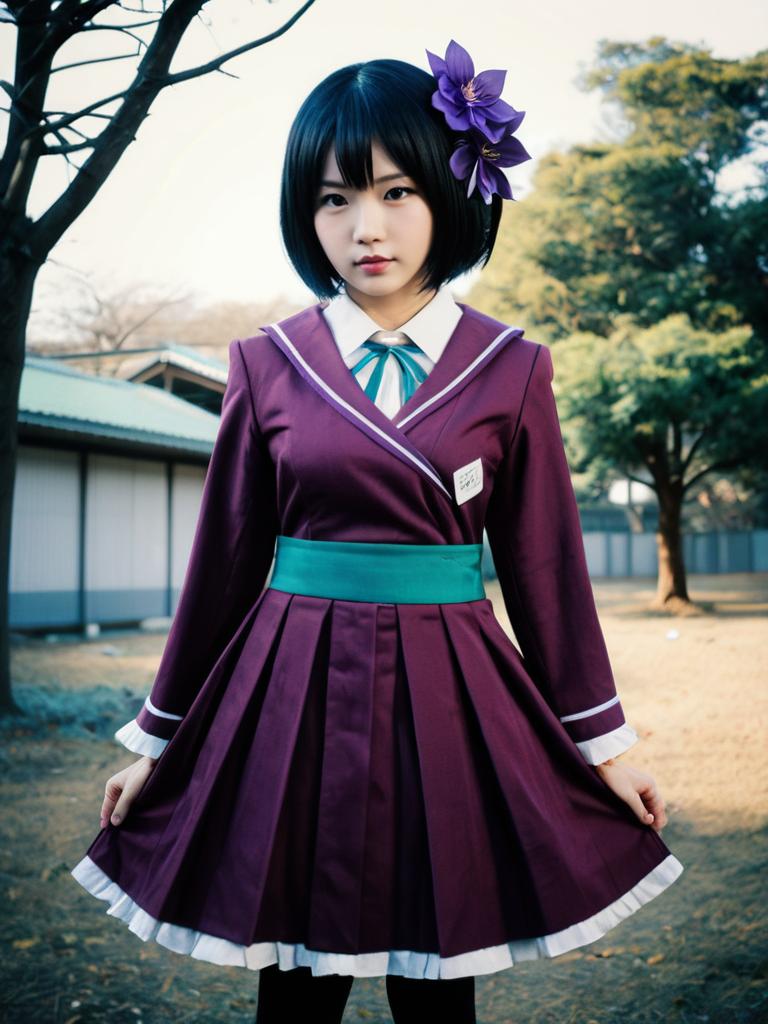 Sexy cosplay woman character wearing Nozomi Tojo costume. Realistic photo. Jane Doe dressed as Nozomi Tojo --sref 1393