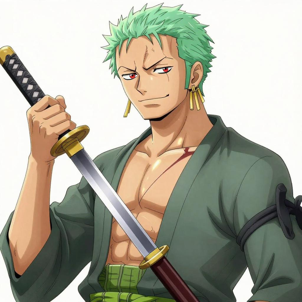 Anime-style digital drawing of a muscular man with green spiky hair, holding a katana, wearing a dark green kimono, and gold earrings,