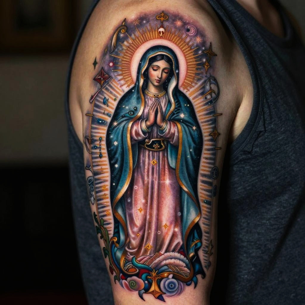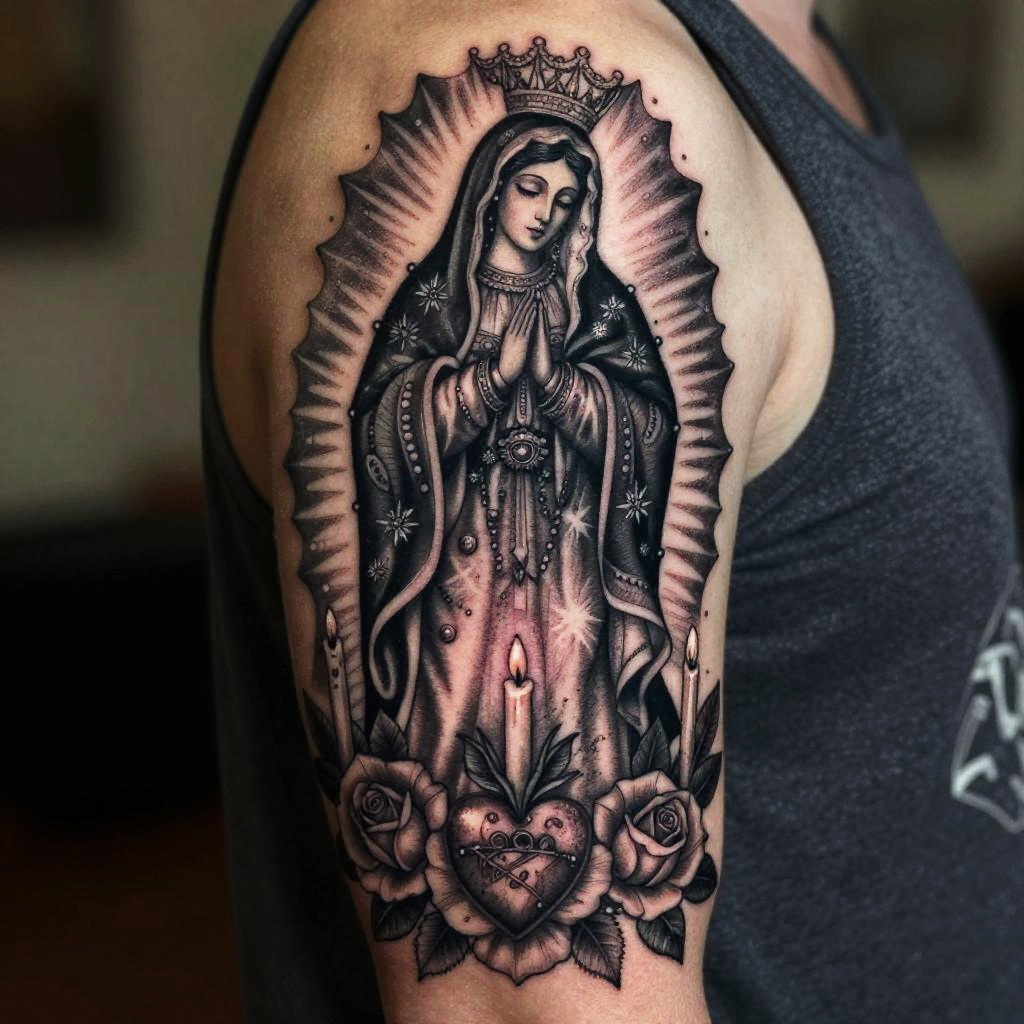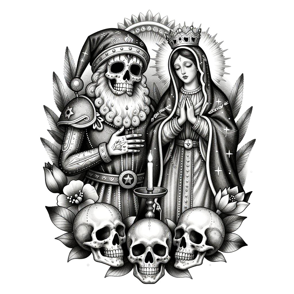 Tattoo artwork featuring Santa Muerte and Virgin Mary, elegant fusion of dark gothic and sacred imagery, detailed linework with symbolic elements like crosses, rosary beads, and flames, creating a powerful and reverent visual narrative.