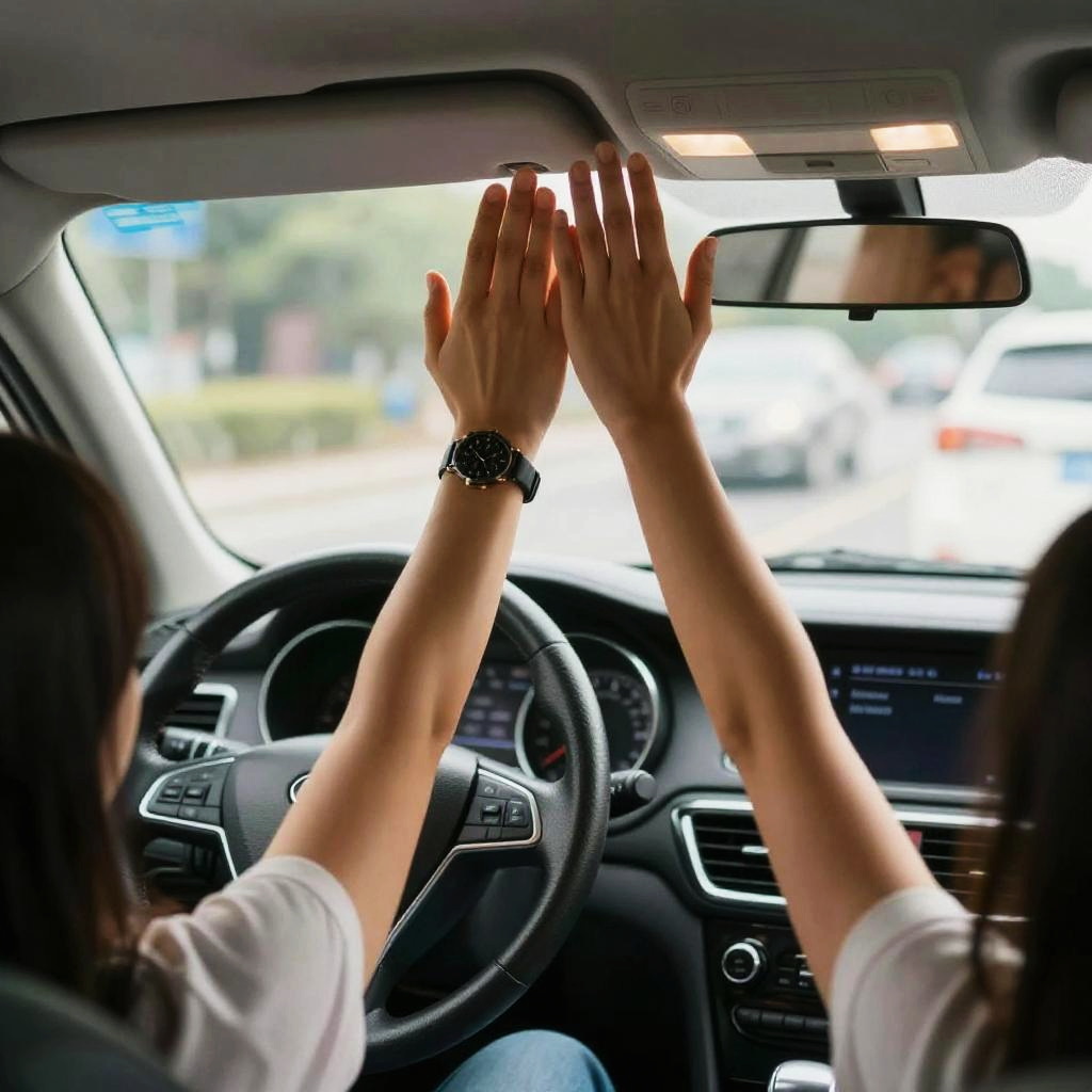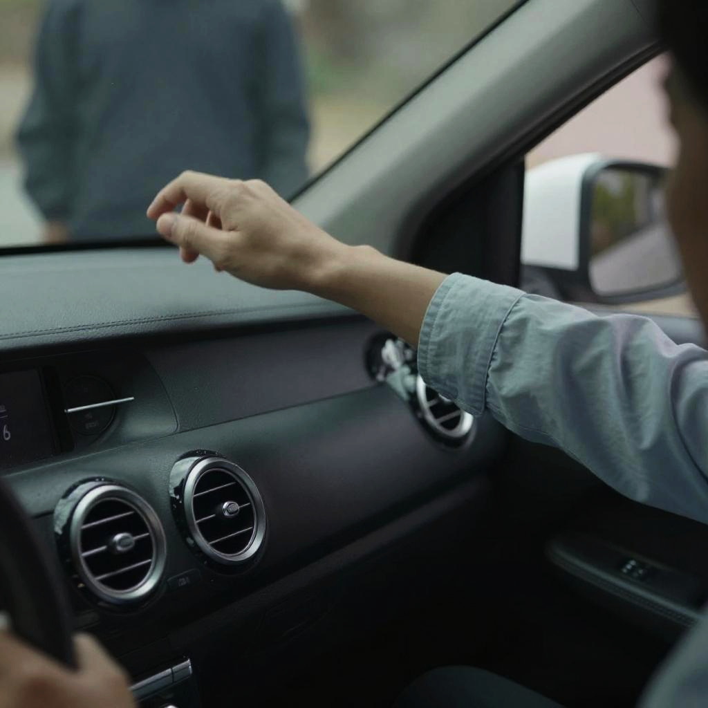Photograph of a light-skinned hand with a black wristwatch resting on the gear shift of a car's center console. The hand is slightly bent at the fingers, with visible veins and a subtle tan line. The background includes a dark, glossy dashboard with illuminated buttons and a red leather seat visible on the bottom right. The image has a slight blur, giving it a dynamic feel.