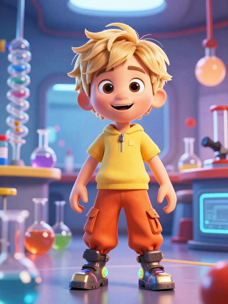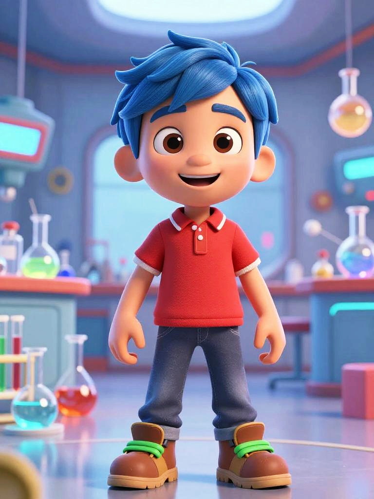 3D cartoon cat in a futuristic science lab, early teen boy, smooth blue-dyed hair with a side part, red polo shirt with contrasting collar and baggy orange cargo pants, small futuristic glowing boots, standing in the middle of a colorful laboratory full of retro control panels with blinking lights, surprised and amazed, soft cinematic lighting, Pixar-style 3D animation, bright saturated colors, high resolution