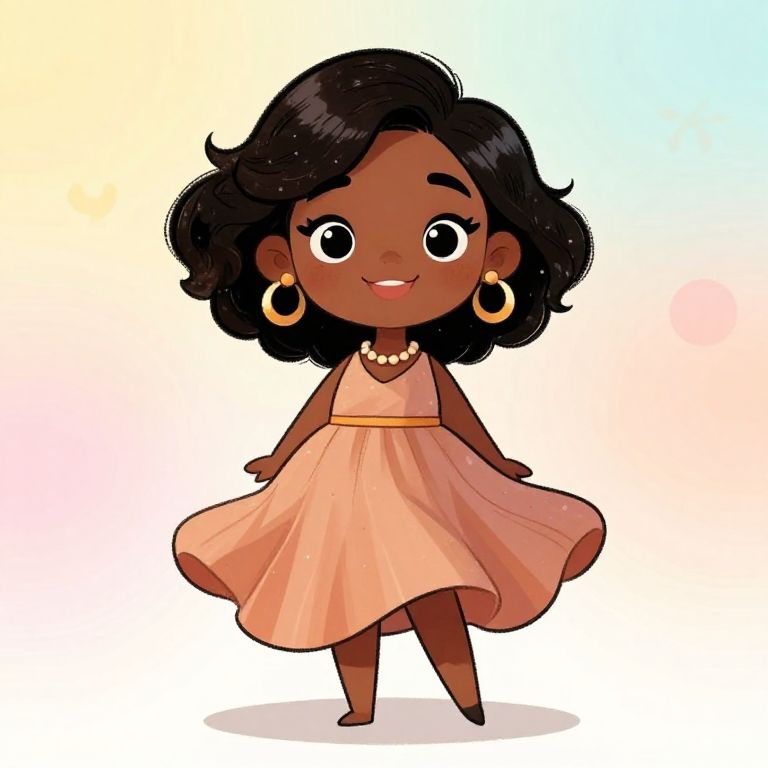 Digital illustration of a cute, chibi-style Black girl with dark brown skin and large, expressive eyes. She has shoulder-length, wavy black hair and wears golden hoop earrings and a pearl necklace. Her outfit is a sleeveless, peach-colored, knee-length dress that flares out slightly as she stands. She is smiling and appears to be gliding or twirling. The background is a gradient of soft pastel colors, transitioning from yellow to blue. The overall style is whimsical and playful, with a focus on the character's charming and joyful expression.