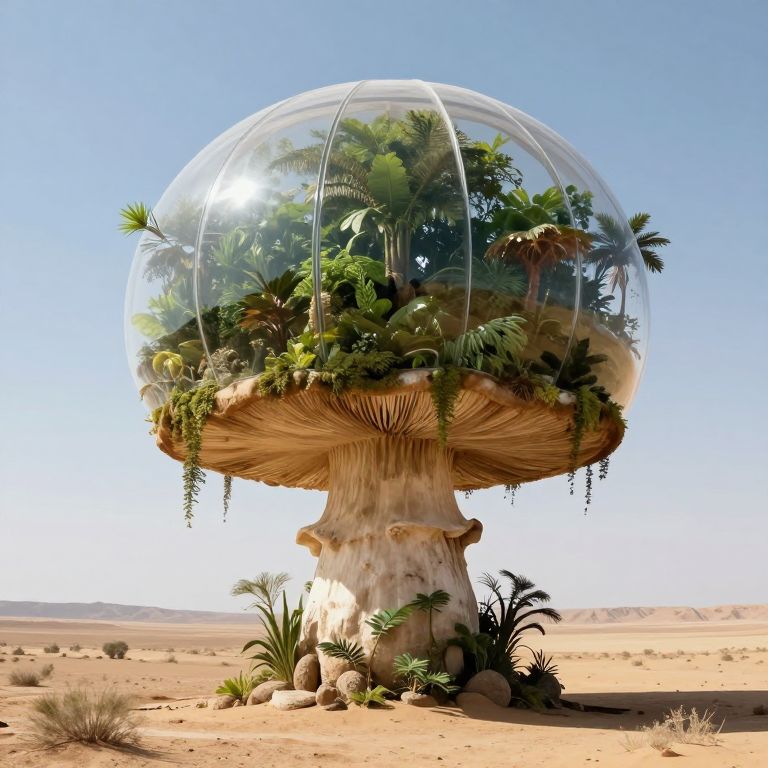 Photorealistic digital art depicting a giant mushroom with a thick, beige, textured stem and a large, brown cap. The mushroom's cap is encased in a transparent, dome-shaped glass sphere filled with lush green ferns and palm plants. The background is a clear, bright blue sky and a barren, sandy desert with sparse, desert vegetation. The dome's reflection on the glass shows the bright sunlight. The scene combines surrealism with botanical elements, creating a striking contrast between the natural and futuristic.