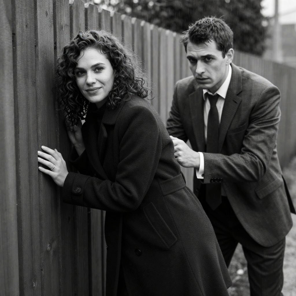 Black-and-white photograph of two people against a wooden fence. Woman with curly hair, wearing a dark coat, leans forward, hands on fence. Man in checkered suit, white shirt, and tie, grips her coat from behind. Man's intense gaze, woman's smiling. Rainfall visible in background.