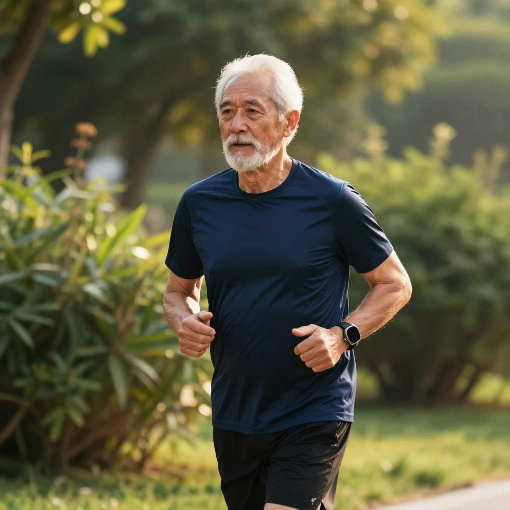 An elderly man with white hair and beard wearing glasses and a white t-shirt, sitting relaxed in a hammock outdoors, reading a book, surrounded by lush green garden background, bright and warm natural sunlight, calm and peaceful atmosphere