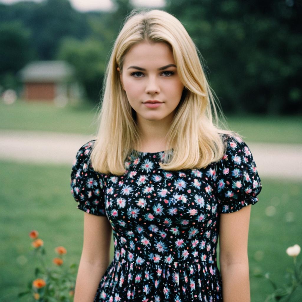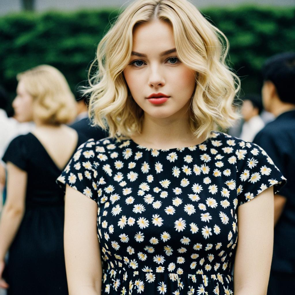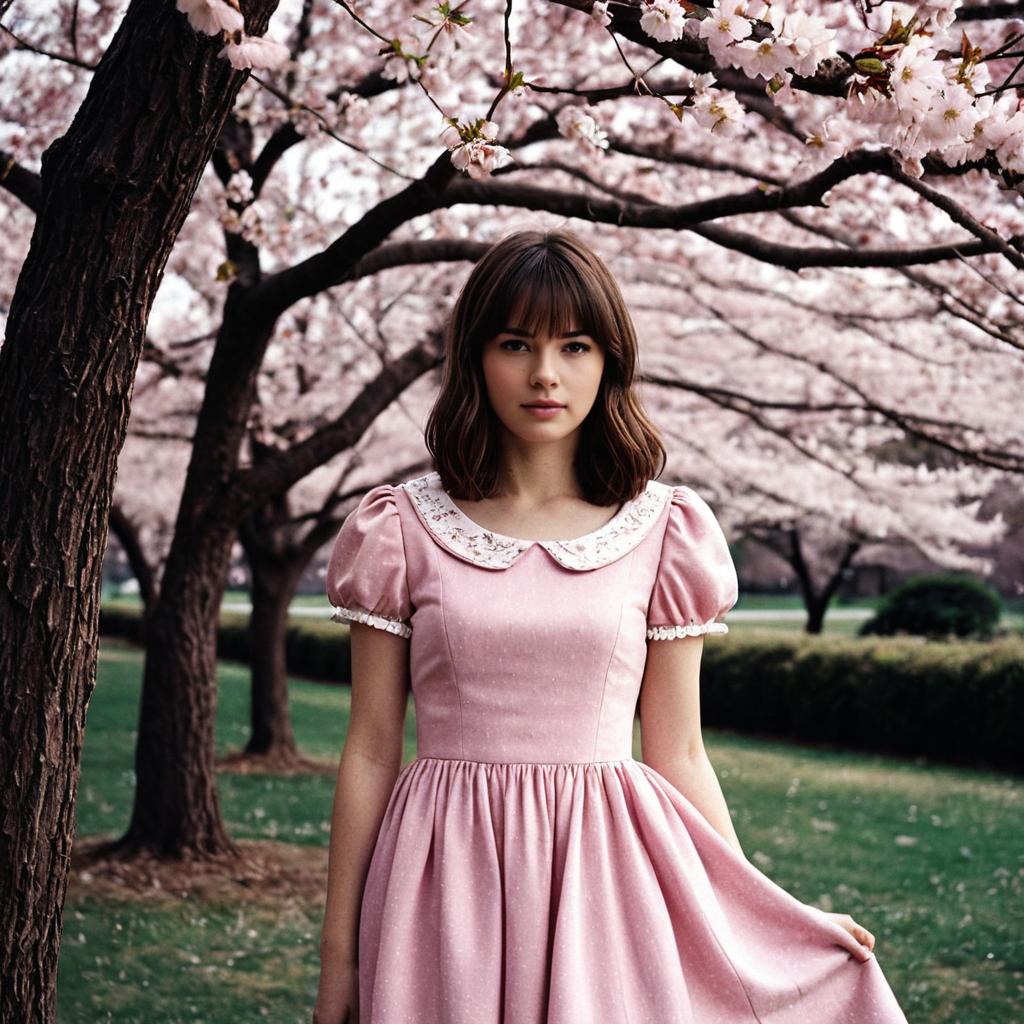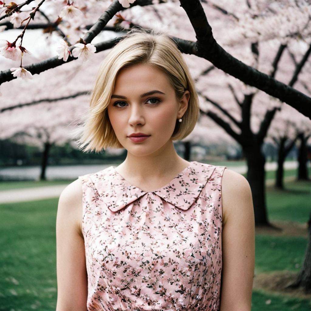 Gatsby style dress,1girl, solo, blonde hair, dress, tree, outdoors, short hair, cherry blossoms, realistic, looking at viewer, blurry, sleeveless, pink dress