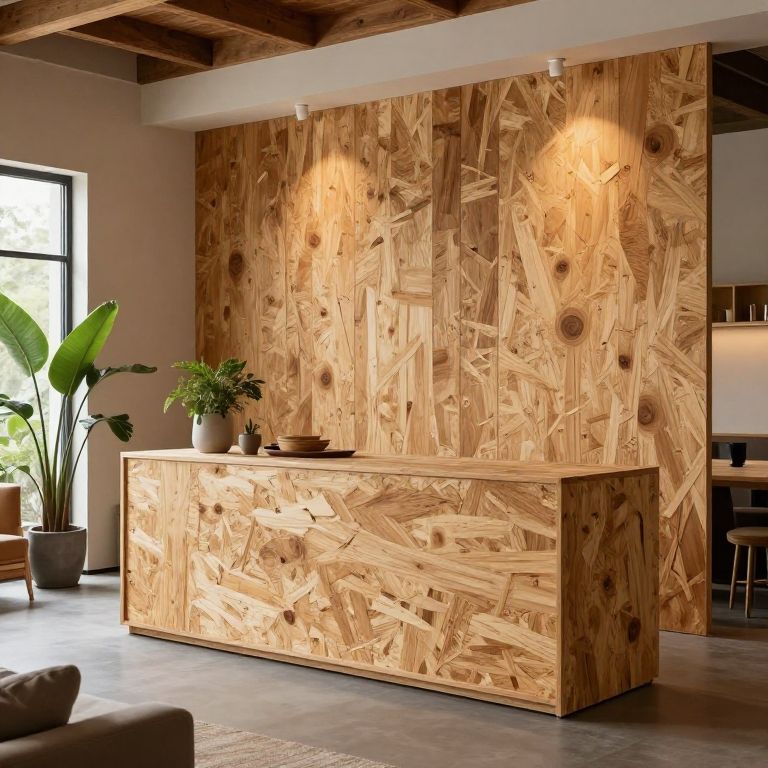 Interior design featuring OSB furniture and wall panels, modern rustic aesthetic with soft ambient lighting, combining natural textures and contemporary shapes, spacious loft room with natural plants and warm wood tones.