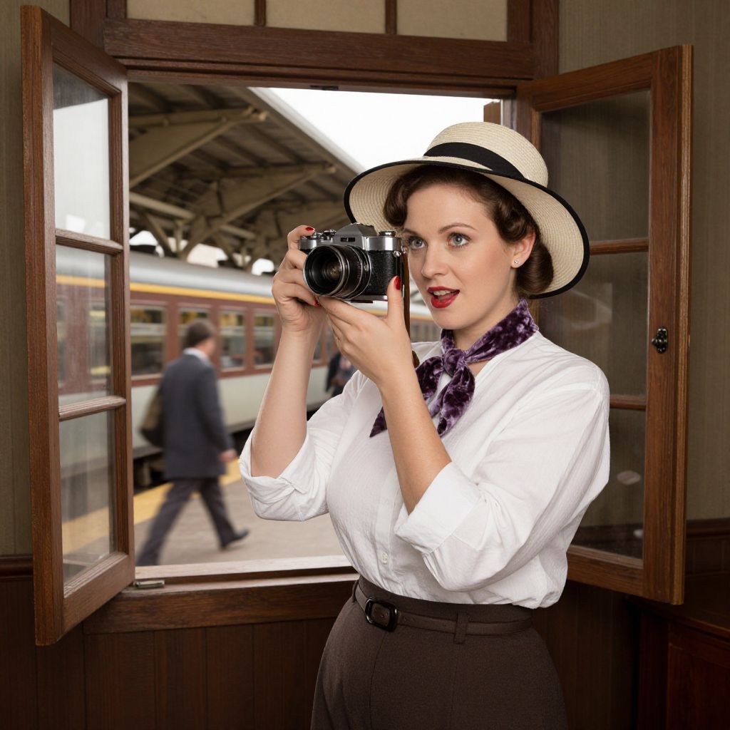 Photograph of a fair-skinned woman with vintage-style makeup, red lipstick, and dark wavy hair, wearing a white blouse, dark high-waisted skirt, purple patterned scarf, and white wide-brimmed hat. She holds a black camera to her face, smiling, standing in a wooden-framed doorway with open glass panes. Background shows a blurred train station with a man in a suit walking and a red train. The setting has a nostalgic, mid-20th-century feel, with warm, natural light filtering in.