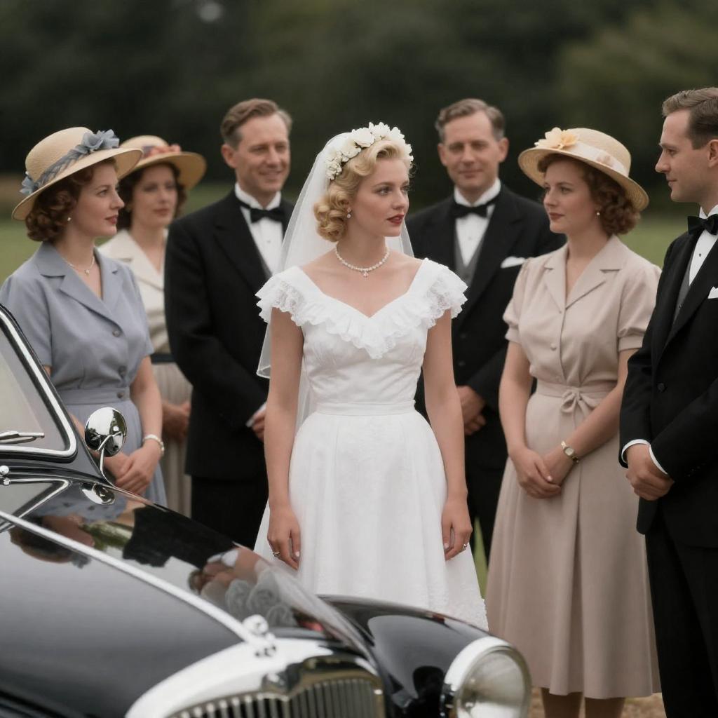 Photograph of a vintage movie poster. Group of seven people in formal and semi-formal attire, sitting and standing in a living room. Central man with glasses and suit sits, looking at a woman in a green dress. Four men and two women, intense expressions. Red background on the left, detailed furniture and curtains on the right.