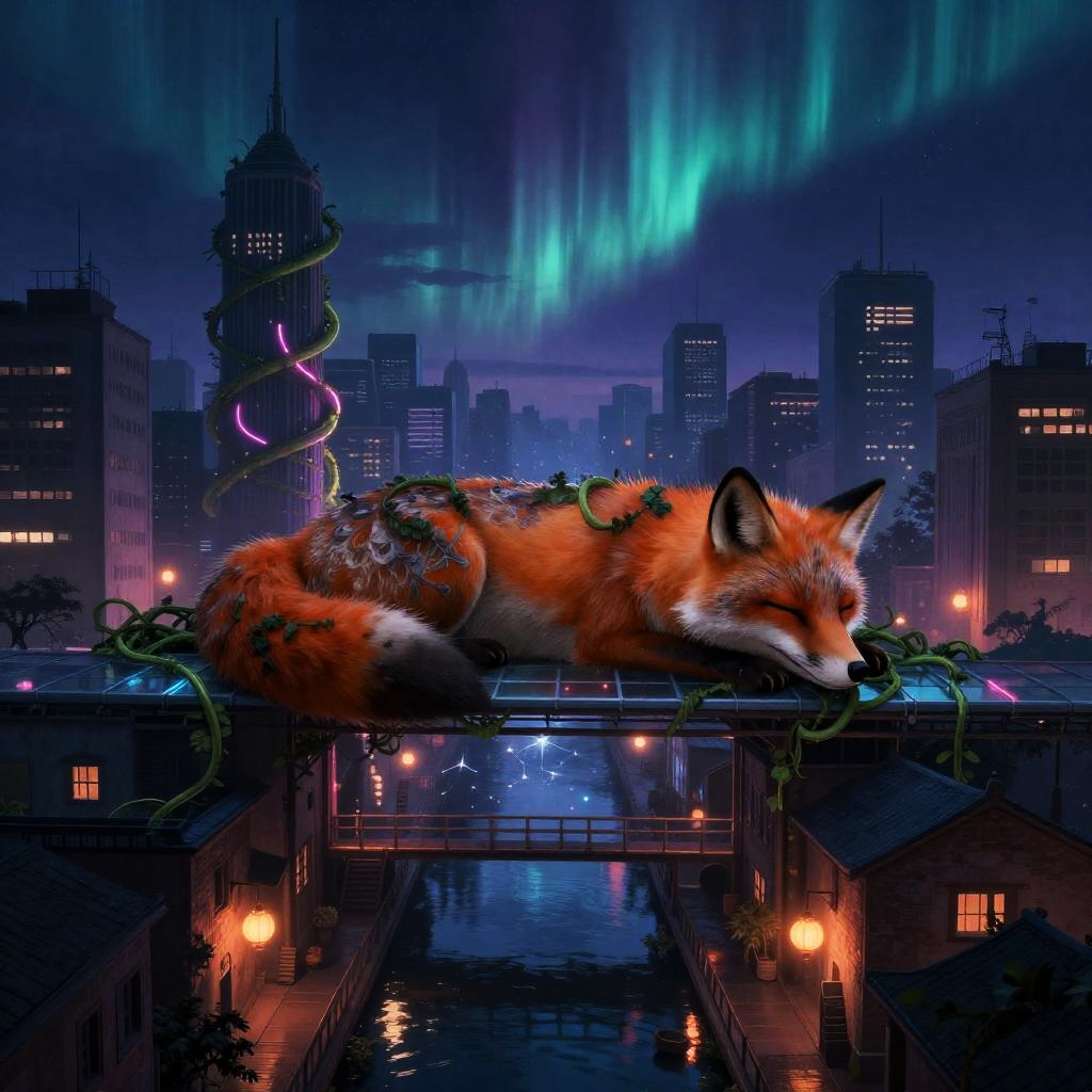 A surreal illustration of a sprawling cityscape on the back of a colossal sleeping fox, with neon vines, lantern-lit alleyways, and glass walkways revealing constellations below, in an aurora-lit indigo dusk above reflective canals, created in nocturnal surreal urban dreamscape, dreamlike and captivating