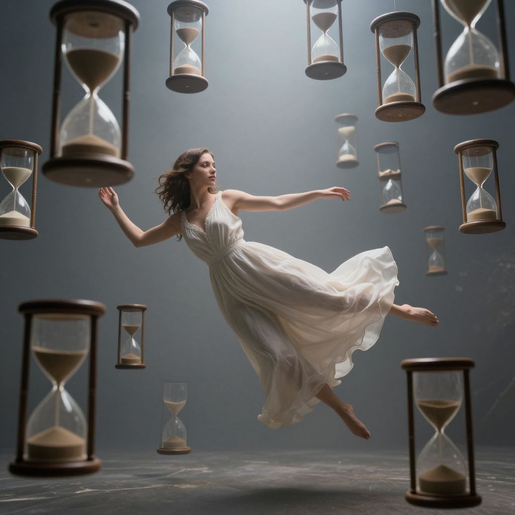 Suspended in a dreamlike expanse, a woman floats amidst a cascade of hourglasses, their sand shifting like whispers of time, evoking a profound sense of transience and the ethereal dance between memory and eternity.
