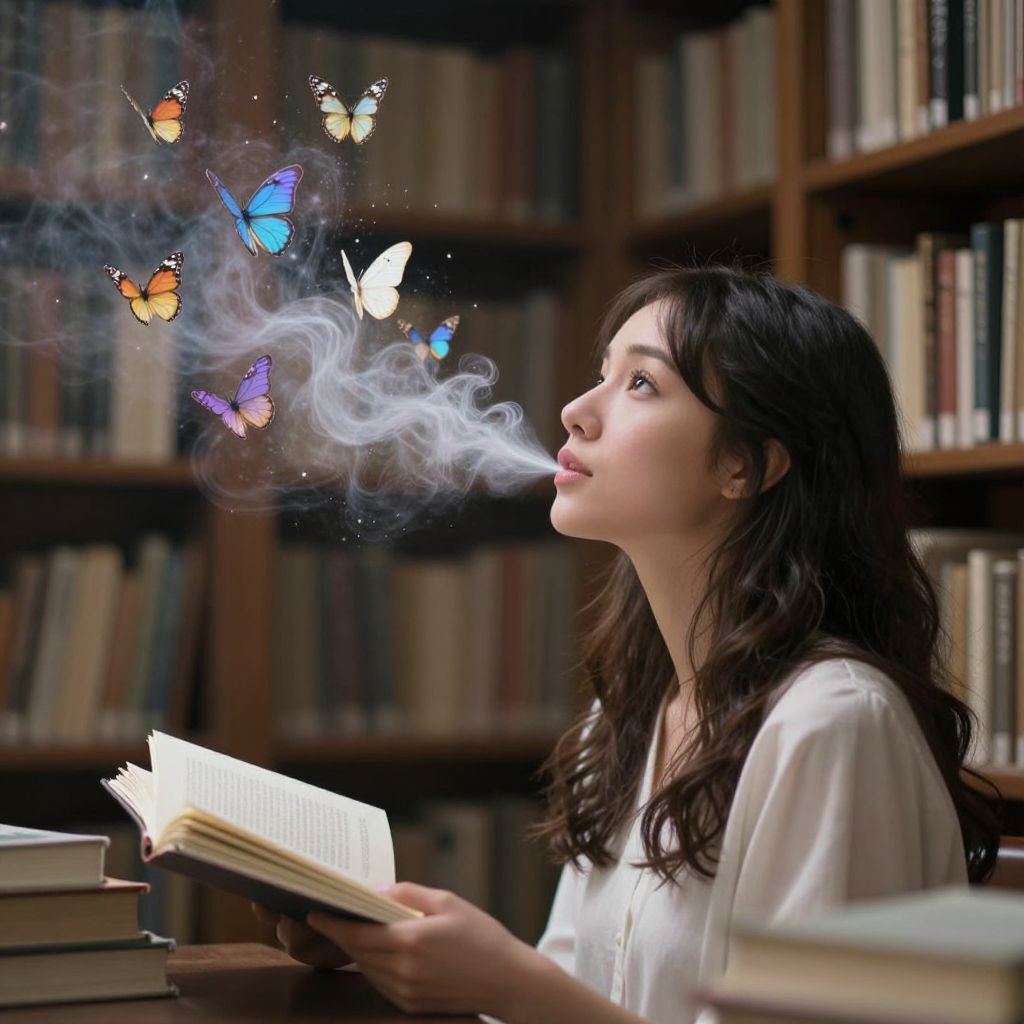 A digital artwork depicts a serene library scene where a woman exhales a stream of butterflies and swirling pages, symbolizing the magical creation of stories through whispered thoughts, rendered in a dreamy, ethereal style with soft lighting and a cinematic depth of field.