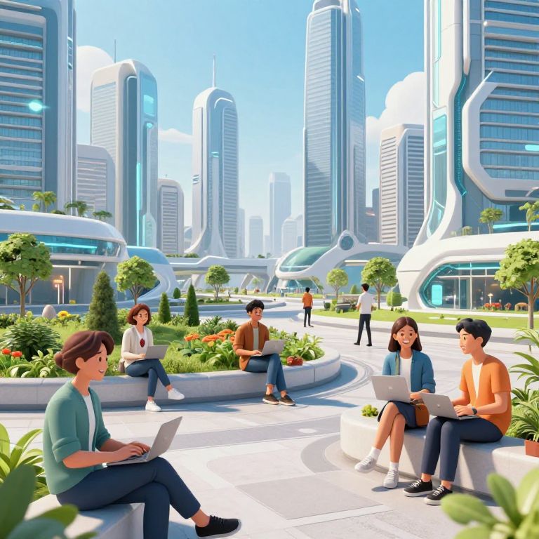 This digital illustration depicts a futuristic cityscape with a group of five young adults, three women and two men, sitting on a curved white bench in the foreground. They are engaged in reading or working on laptops. The background features towering, sleek, white and blue skyscrapers with futuristic, curved designs. The sky is clear and blue, and the area is lush with greenery, including well-manicured bushes and trees. The individuals wear casual, modern clothing, including jeans, sweaters, and shirts. The scene conveys a sense of modernity, technology, and urban living.