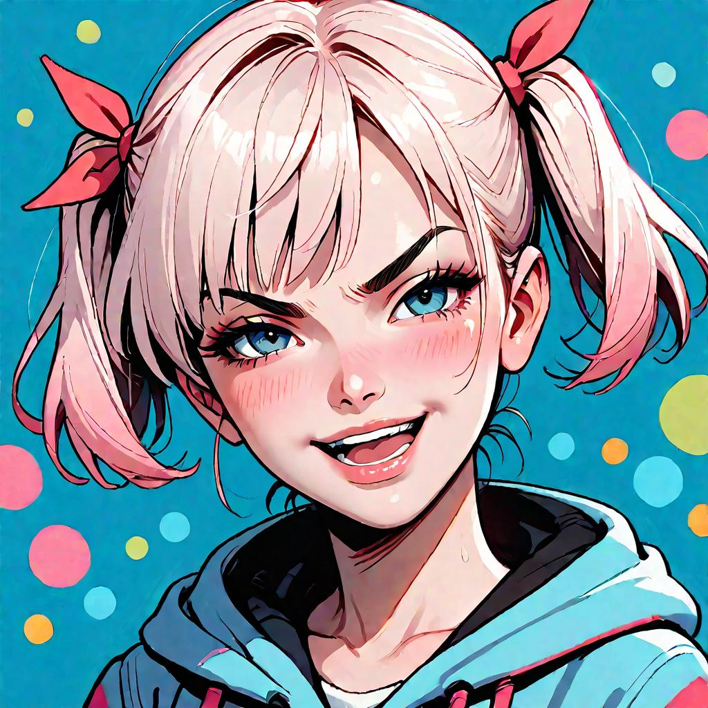 Score_9, score_7_up, score_6_up, score_5_up, score_4_up, source_anime, hoodie, portrait, open smile, teeth, blush, half-closed eyes, v-shaped eyebrows, hair ribbon, short twintails