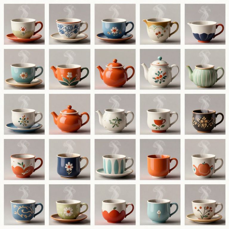Arranged in a grid, twenty-four colorful ceramic tea and coffee items showcase a variety of designs, including cups, teapots, and mugs, each emitting steam to evoke a cozy, inviting atmosphere.
