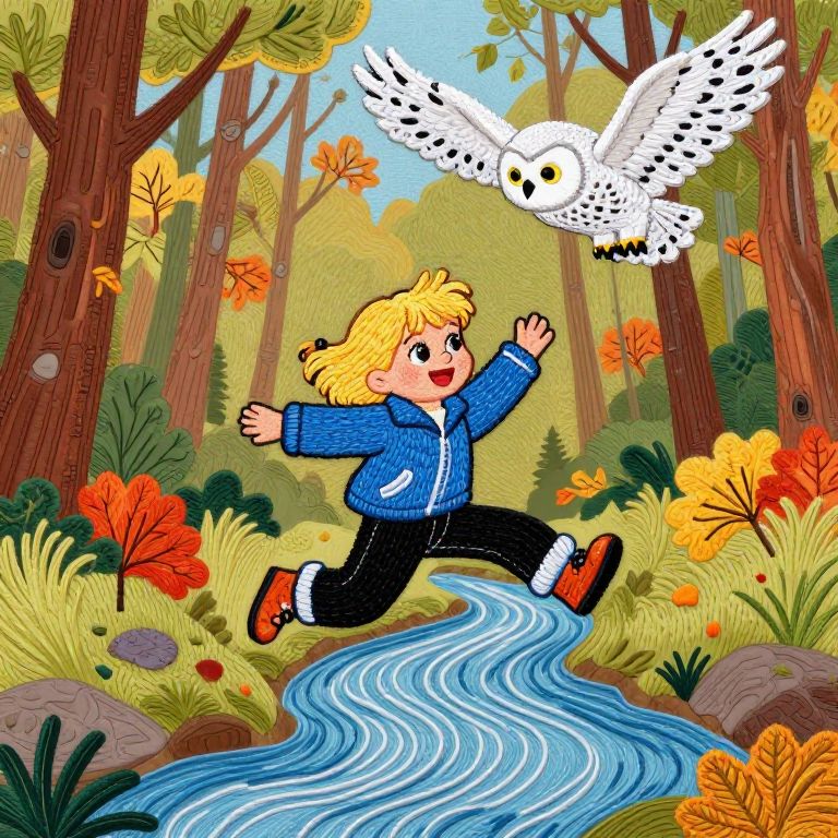 Embroidery Lace A blond girl wearing a blue jacket and black pants jumps over a river in an autumn forest as a snowy owl flies overhead. 4k, colorful, cartoony. 1996.,