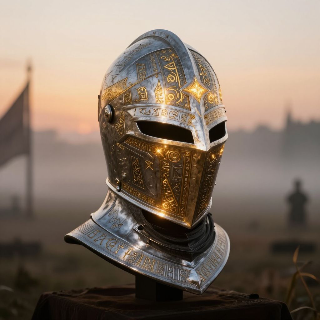 Fantasy knight helmet glowing with intricate runes, forged from enchanted silver and gold, set against a misty battlefield at dawn, epic and mystical atmosphere