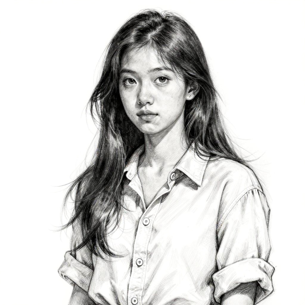 A detailed black and white pencil sketch of a young woman with long flowing hair and expressive eyes, wearing a buttoned shirt with rolled-up sleeves. The portrait focuses on realistic shading and intricate linework to emphasize her features and natural beauty in a classical illustration style.