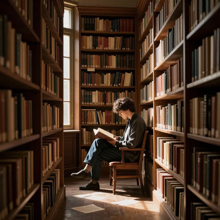 Photograph of a young person with curly hair, dressed in a black shirt and blue jeans, sitting on a wooden chair in a sunlit library aisle. They are focused on reading a book, held open in their hands. The library is filled with tall, dark wooden bookshelves on both sides, packed with books of various colors. A narrow beam of sunlight streams through a window at the back, casting light on the person and part of the floor. The scene conveys a peaceful, scholarly atmosphere.