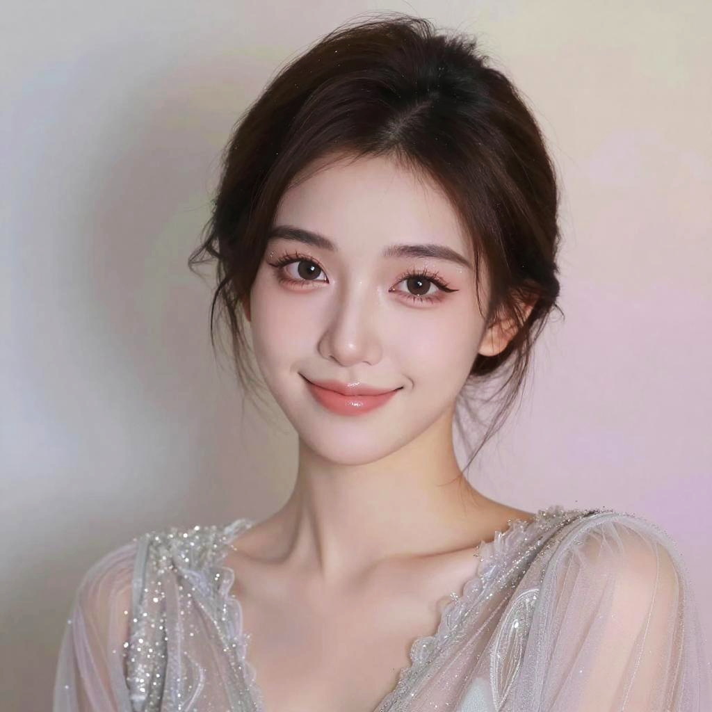Photograph of an Asian woman with fair skin and dark brown hair styled in a loose, slightly messy updo. She has large, almond-shaped brown eyes with long eyelashes, a small nose, and a gentle smile with glossy pink lips. She is wearing a sheer, silver-embellished top with delicate, sparkling details on the shoulders and neckline. The background is a soft, gradient white to light pink, creating a subtle, ethereal effect. The lighting is soft and even, highlighting her smooth skin and the shimmer of her top. The overall style is elegant and slightly whimsical.
