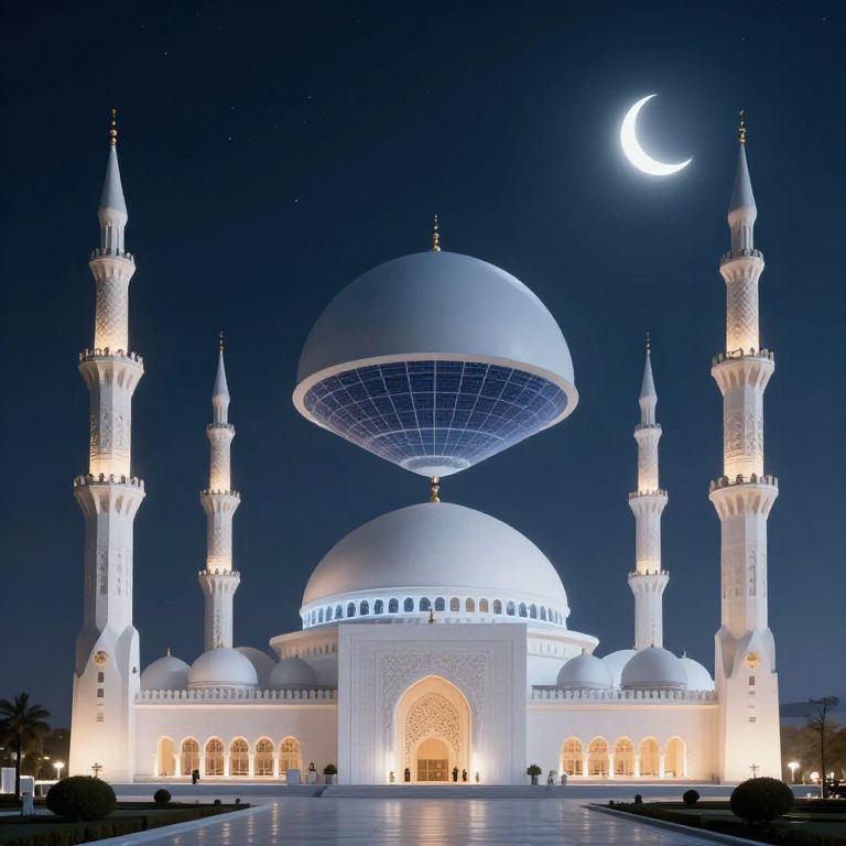 Futuristic mosque with a minimalist design, featuring floating minarets and a levitating dome, advanced sustainable energy panels integrated into the structure, nighttime scene with stars and a glowing crescent moon, blending tradition with innovation, photorealistic rendering.