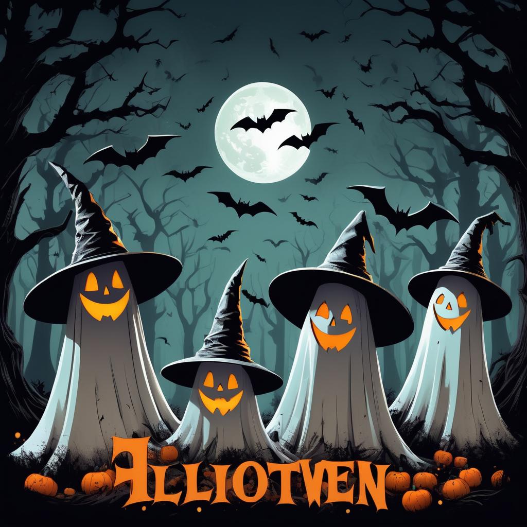 Three ghost figures with shocked expressions wearing worn witch hats, surrounded by flying bats, eerie dark forest background, large stylized orange Halloween text at the bottom, vintage comic book style, spooky Halloween atmosphere