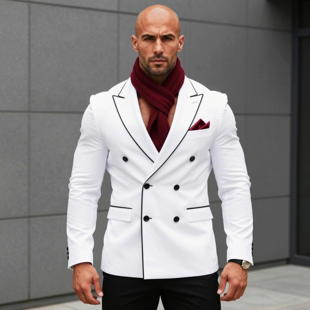 A muscular bald man stands confidently against a modern gray tiled wall, wearing a sharp white double-breasted blazer with black piping and buttons. He complements the look with a deep red scarf and matching pocket square, creating a striking and stylish contrast in this contemporary portrait.