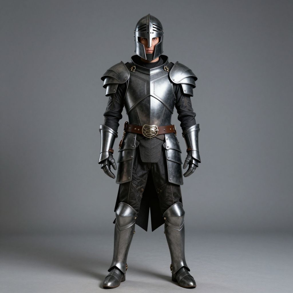 Photograph of a full-body male medieval knight in shiny, silver-colored plate armor. The knight stands with a straight posture against a plain, gradient gray background. He wears a conical steel helmet with a narrow visor, covering his face. His armor includes shoulder pauldrons, a chest plate, gauntlets, and greaves, all reflecting light. A brown leather belt with a large, ornate silver buckle cinches his waist, over dark, layered clothing beneath the armor. Black leather boots complete his outfit. The metallic surfaces of the armor have a polished, reflective texture, contrasting with the matte finish of his leather and cloth garments.