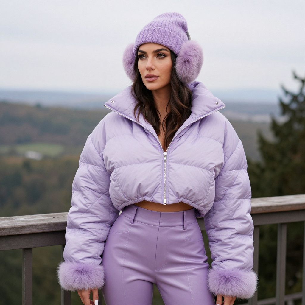 A woman, winter chic, pastel lavender quilted puffer jacket, high collar, wide sleeves, cropped length, matching lavender faux-leather pants, high-waisted fit, faux fur trim at cuffs, coordinating lavender knitted beanie, faux fur earmuffs, at a scenic overlook deck, enjoying the view, visual style: Medium format film Sexy. Pretty face and beаutiful eyes. Big breasts