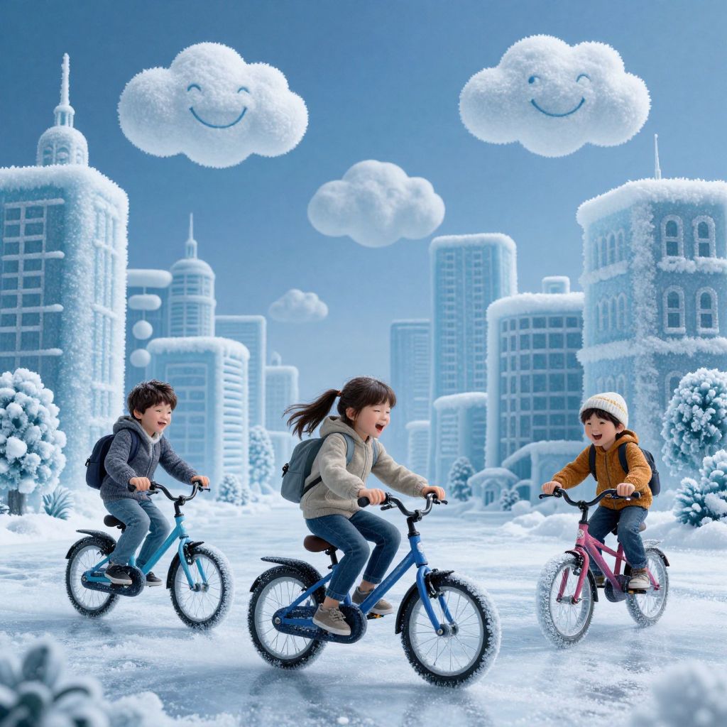 Photograph-like digital illustration of three children riding bicycles in a snowy cityscape. The children, a boy in a gray jacket and blue jeans, a girl in a beige jacket and blue jeans, and another girl in a brown jacket and pink bike, smile joyfully. The background features tall, snow-covered skyscrapers, fluffy snow clouds with smiling faces, and snow-draped trees. The scene is brightly lit with a blue and white color palette, creating a whimsical, winter wonderland atmosphere. The children's bikes are colorful, contrasting with the monochromatic background.