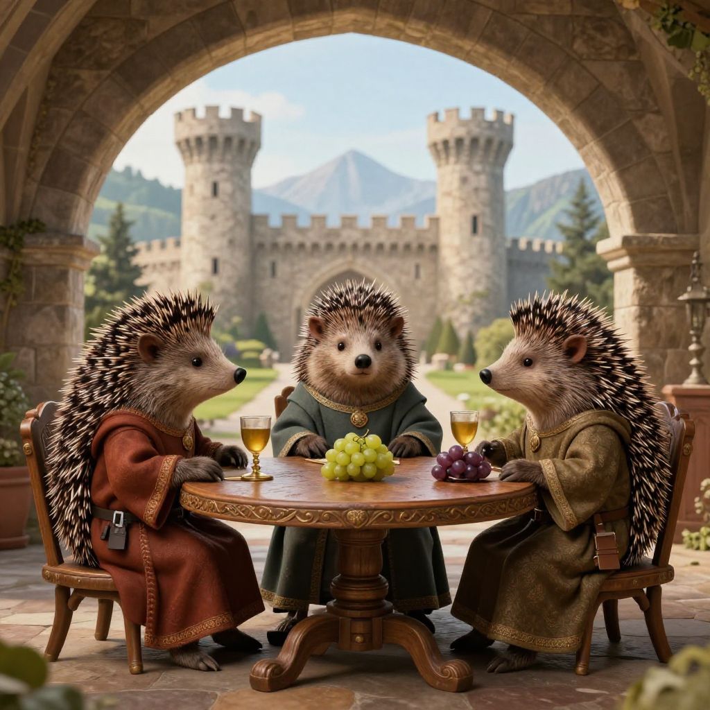 In this whimsical digital illustration, three anthropomorphic hedgehogs dressed in medieval-style robes sit around a round wooden table in a stone archway. The hedgehog in the center, wearing a green robe, faces the other two, who are in red and brown robes, respectively. On the table are a bunch of grapes, a glass of white wine, and a glass of red wine. The background features a grand, medieval castle with tall towers and a mountainous landscape under a bright blue sky. The image blends fantasy and medieval elements, creating a charming and surreal scene.