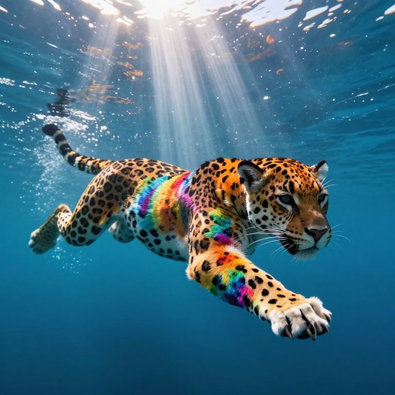 Fashion Consultant jaguar with rainbow patterned fur, swimming in the ocean, light beams filtering through the water, downwards perspective, 4k hd, lisa frank style,