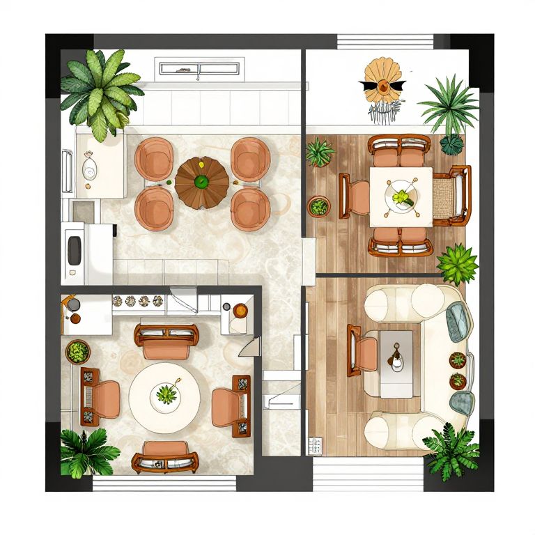 Floor plan design for restaurant featuring an open kitchen concept, cozy dining areas with varied seating arrangements, decorative plants, and artistic wall accents, illustrated with detailed architectural elements and a vibrant color scheme.