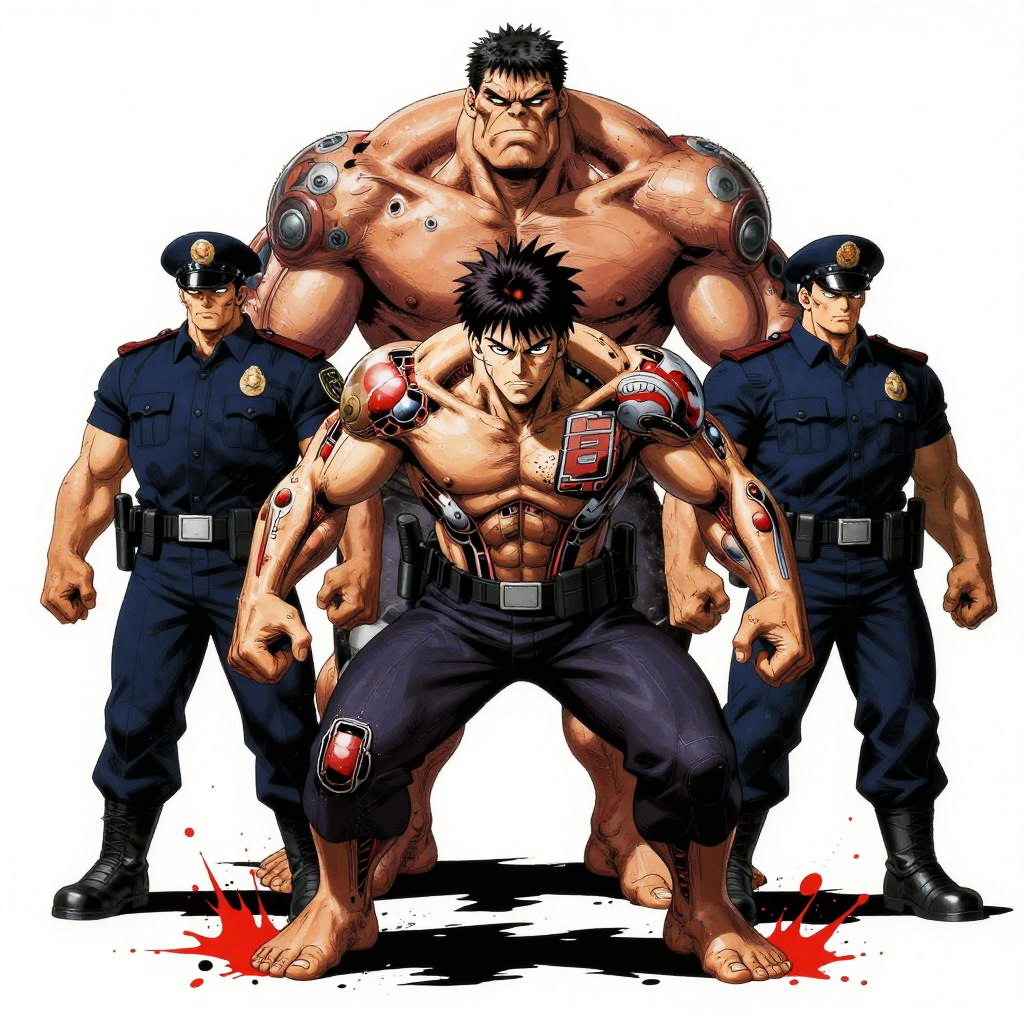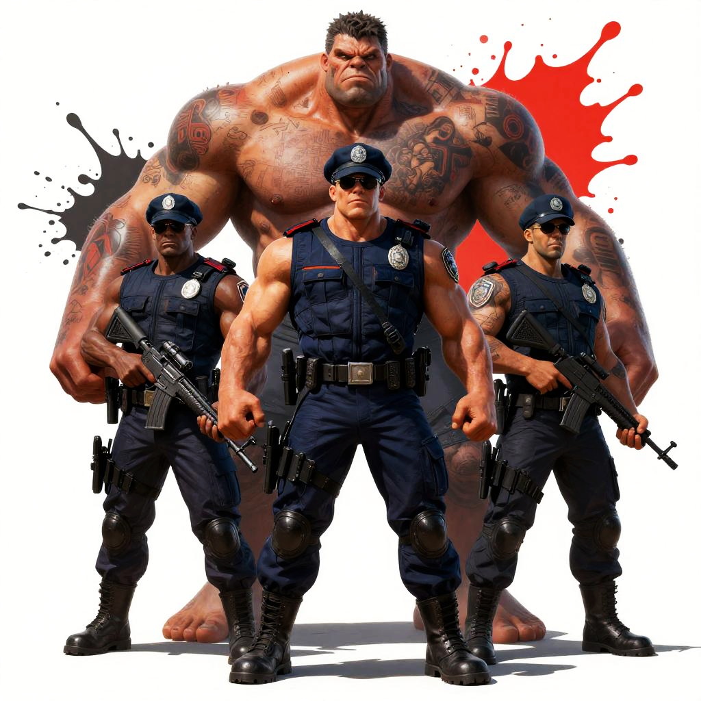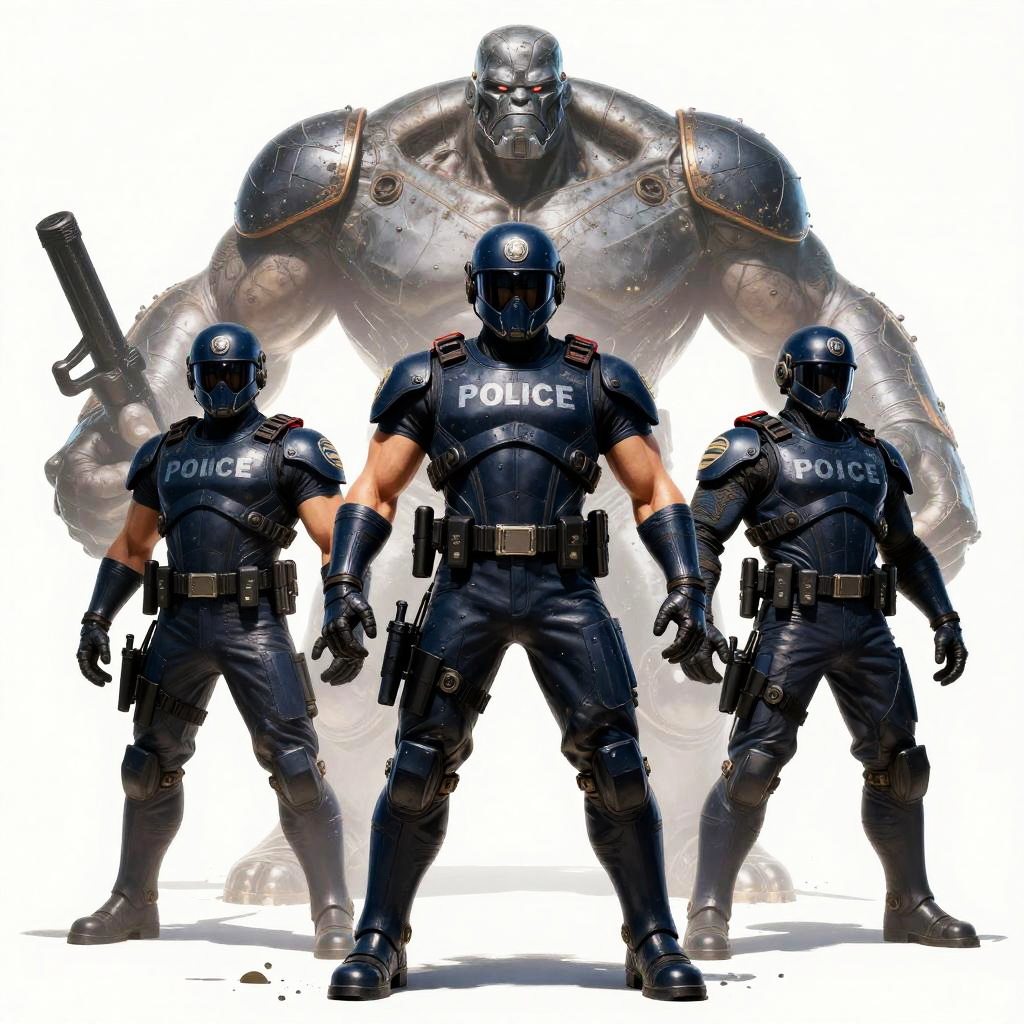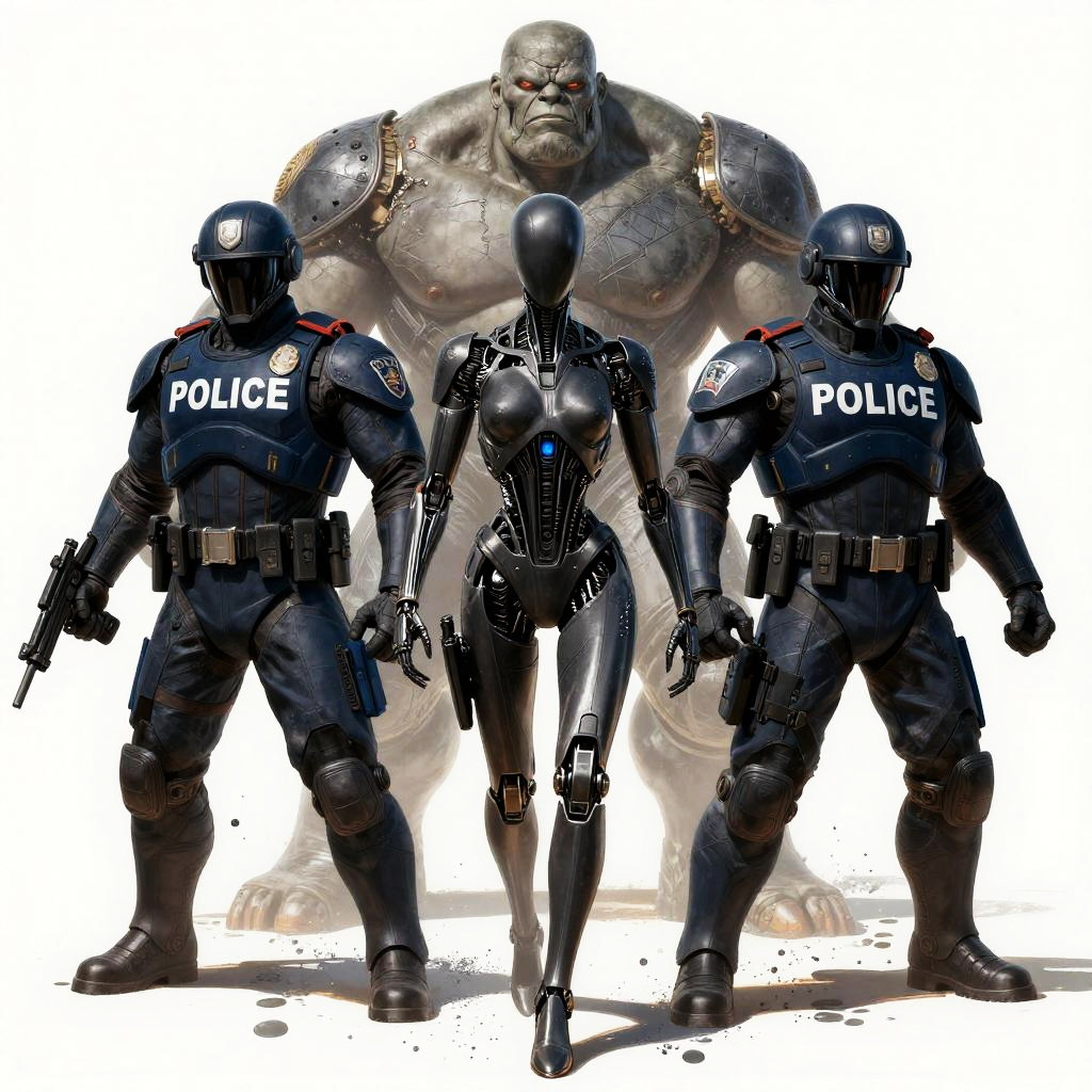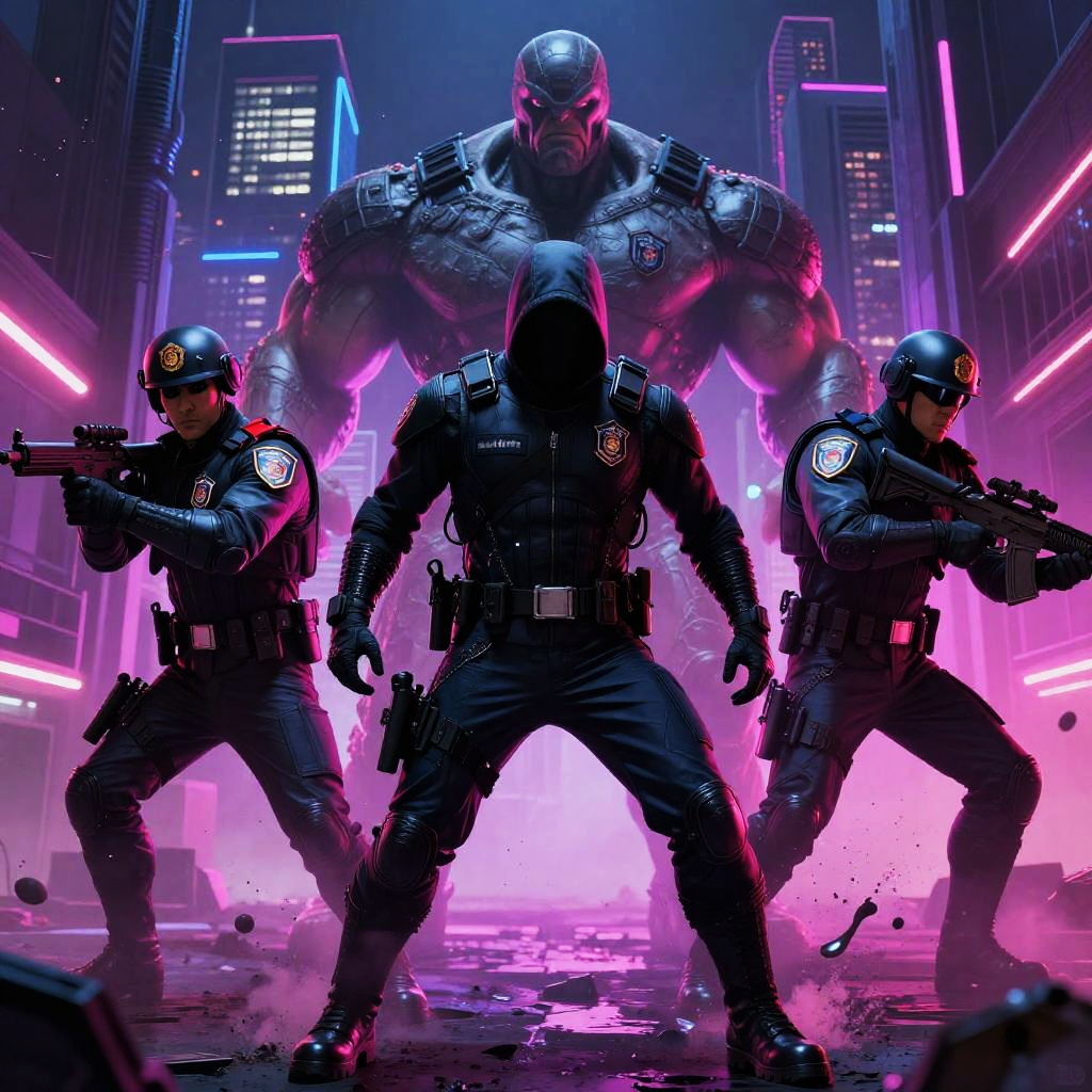 Augmented heist planner evading hulking police troopers, splash art with high-contrast colors, by Paul Chadeisson, highly detailed, dystopian, Greg Rutkowski style