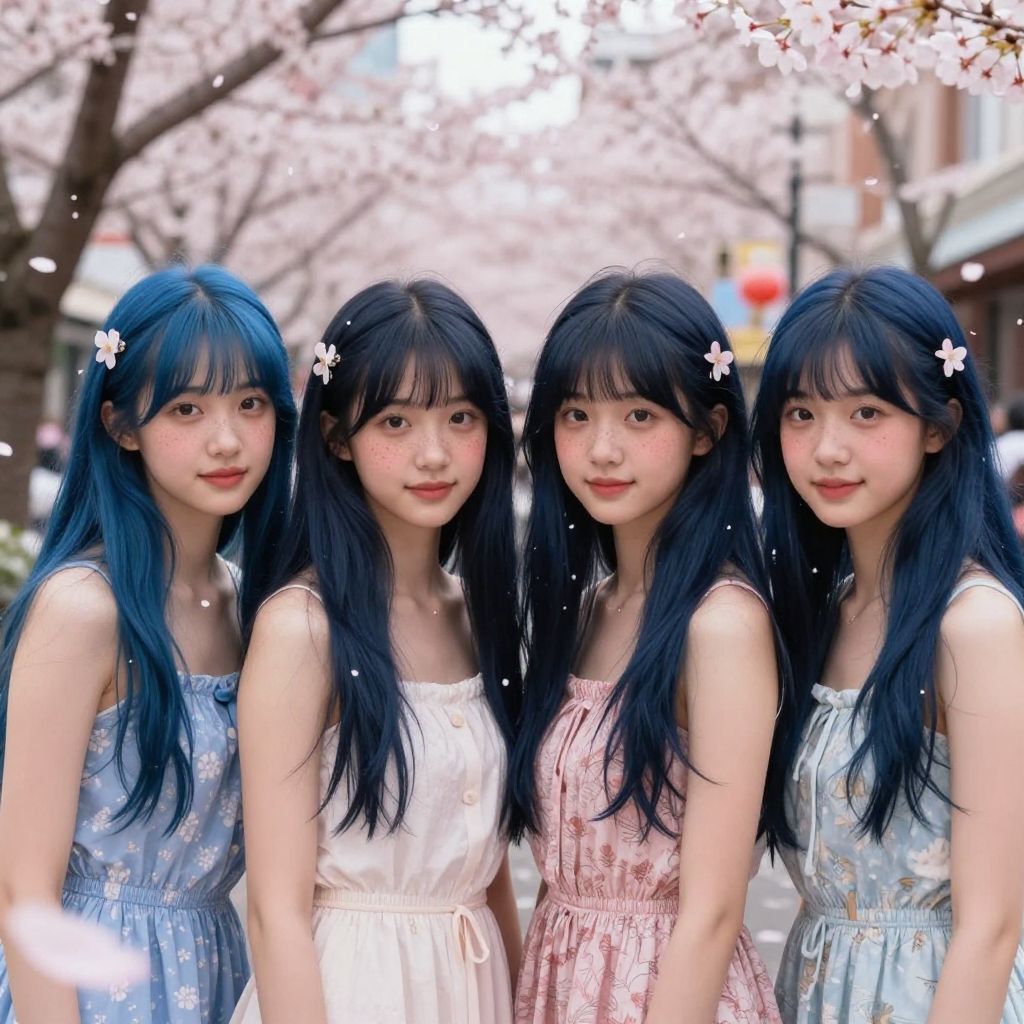 8k photorealistic, attractive, female, 20 year-old, freckle face, radiant, four females, youthful face, blue and black long haired, quadruplet, similar to marinette dupain-cheng from miraculous ladybug, in a sundress, nipslip, windblown hair, Downblouse4:1 photograph of a cute girl, cute hairpin, dark navy blue hair, pale skin, freckles, blush, innocent, city spring festival, sakura petals in the air, Porta 160 color, shot on ARRI ALEXA 65, bokeh, sharp focus on subject, shot by Don McCullin, nsfw, Hyper-realistic, ultra-detailed photographic images
