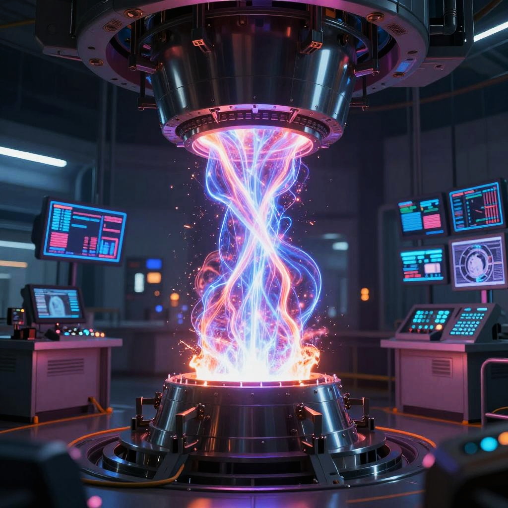 Warpfusion, a futuristic fusion reactor emitting swirling vibrant plasma streams, set in a high-tech laboratory filled with glowing control panels and holographic displays, neon colors, and dynamic light reflections, cinematic atmosphere, ultra-detailed sci-fi aesthetic.