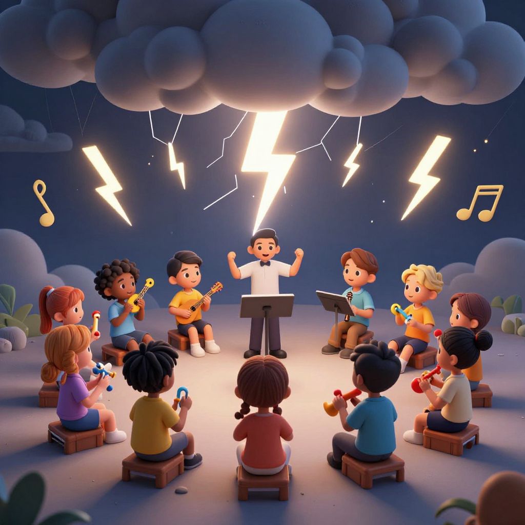 In a vibrant digital illustration, a group of young children, each holding toy instruments, sits in a semi-circle around a central conductor, creating a whimsical symphony as they transform the dramatic lightning bolts beneath a storm cloud into rhythmic melodies, blending reality with fantasy in a high-definition, computer-generated scene.