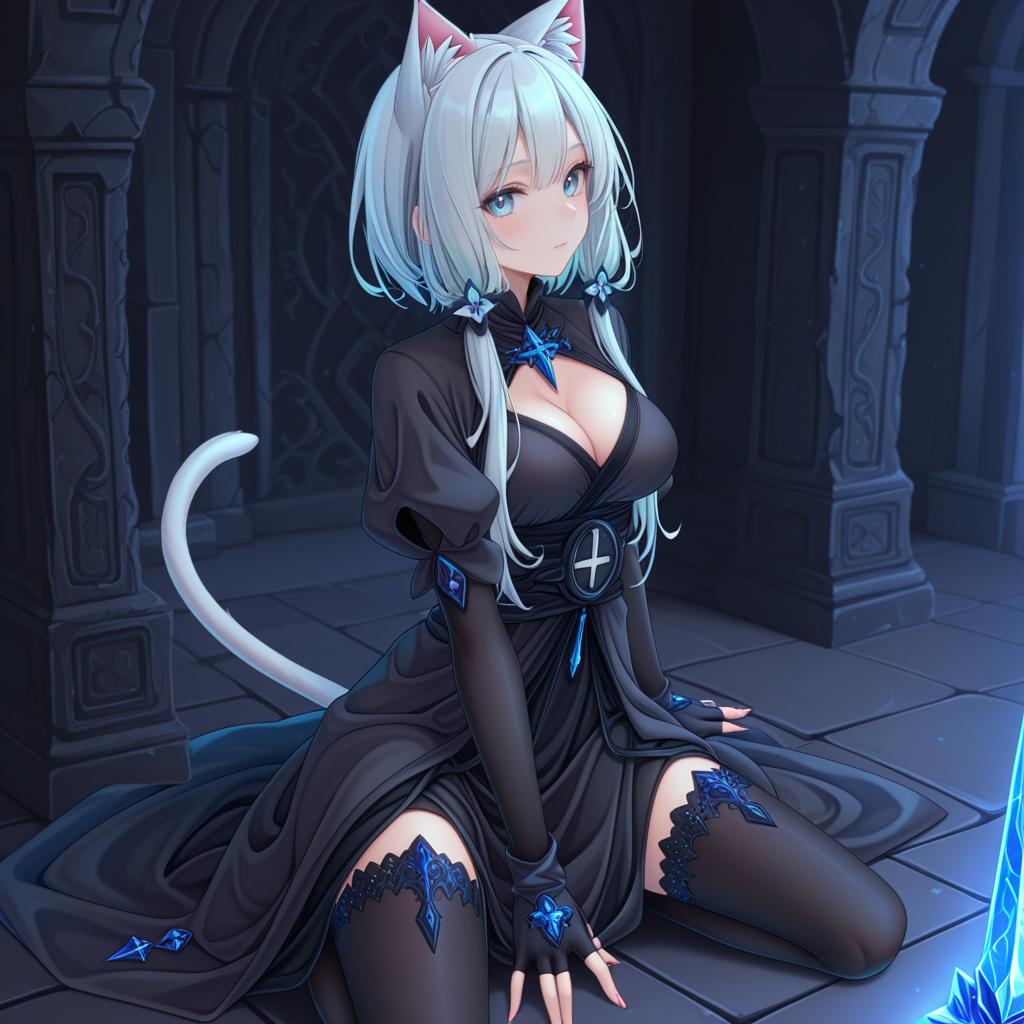 Monk (final fantasy), final fantasy, 1girl, cat ears, cat tail, blue eyes, short hair, long hair, fingerless gloves, miqo'te, by artist yoye (pastel white), dark_illustrious