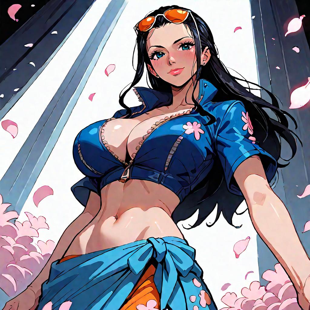Score_9, score_8_up, score_7_up, source_anime, 1girl, solo, long hair, breasts, looking at viewer, smile, blue eyes, large breasts, black hair, navel, cleavage, closed mouth, standing, collarbone, blue jacket, short sleeves, cowboy shot, midriff, shiny, signature, stomach, crop top, petals, eyewear on head, zipper, cropped jacket, sarong, zipper pull tab, tinted eyewear, hair slicked back, collared jacket, partially unzipped, nico robin, from below