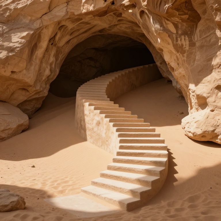 Photograph of a natural rock cave with a spiral stone staircase. The staircase, made of smooth, sunlit beige stones, curves upwards into the dark cave entrance. The surrounding rock walls are rugged and textured, showcasing layers of sandstone in shades of tan and brown. Sunlight casts shadows on the sandy floor, highlighting the cave's contours and the staircase's steps. The cave's arched ceiling is intricately formed, adding a sense of depth and mystery. The scene evokes a sense of adventure and exploration in a desert-like environment.