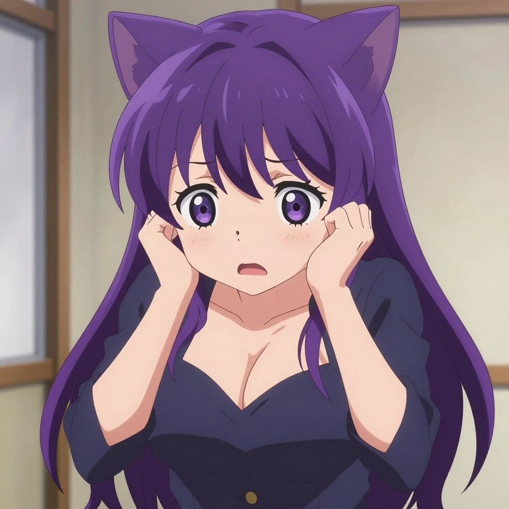 Purple cat ears, extra ears, panic, scared, dark blue school uniform, medium breasts, (ultra realistic, 32k, masterpiece:1.1), (high detailed skin:1.1), (high quality:1.1), eyelashes, long hair, curvy, ((komi shouko)), (komi-san wa komyushou desu), (no mouth, no nose, big eyes:1.3), solo