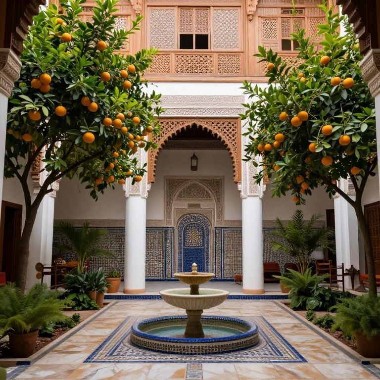 Moroccan Riad Courtyard with Orange Trees and Fountain