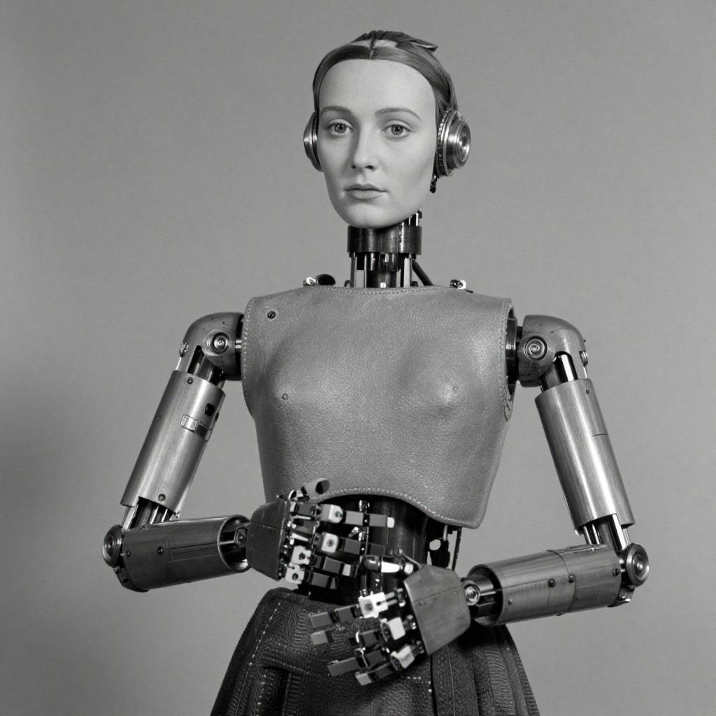 Photograph of a female humanoid robot with metallic joints, a textured chest plate, and a mechanical hand, standing against a plain gray background. Blue mon